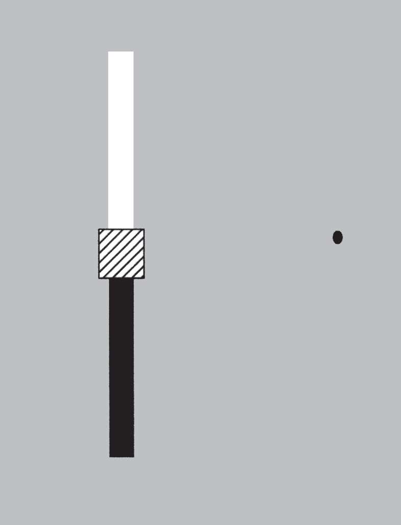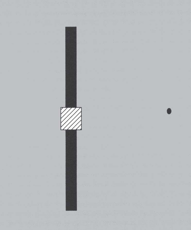 医生给他做了进一步的检验,让他看像图 2.7 那样的图,只不过把中间的方块去掉了。而且由于乔希的盲区比正常人的盲点要大得多,所以上下两条黑条之间的孔隙也要大得多,上面的黑条延伸到他的盲区上缘,下面的黑条顶端就在盲区的下缘。医生问他看到的是一条连续的黑条,还是上下两段分开的黑条。他想了想,说:“呃,我看到有两条,一条在上面,一条在下面,中间有很大的一片空白。”医生淡然地答了一声:“好吧!”认为没有发现什么奇怪的地方。就在这时,乔希把眼睛眯了起来,并说:“等一等,你知道发生了什么奇怪的事情了吗?上下两条在向对方延伸过去。”医生大为吃惊:“你在说什么?”