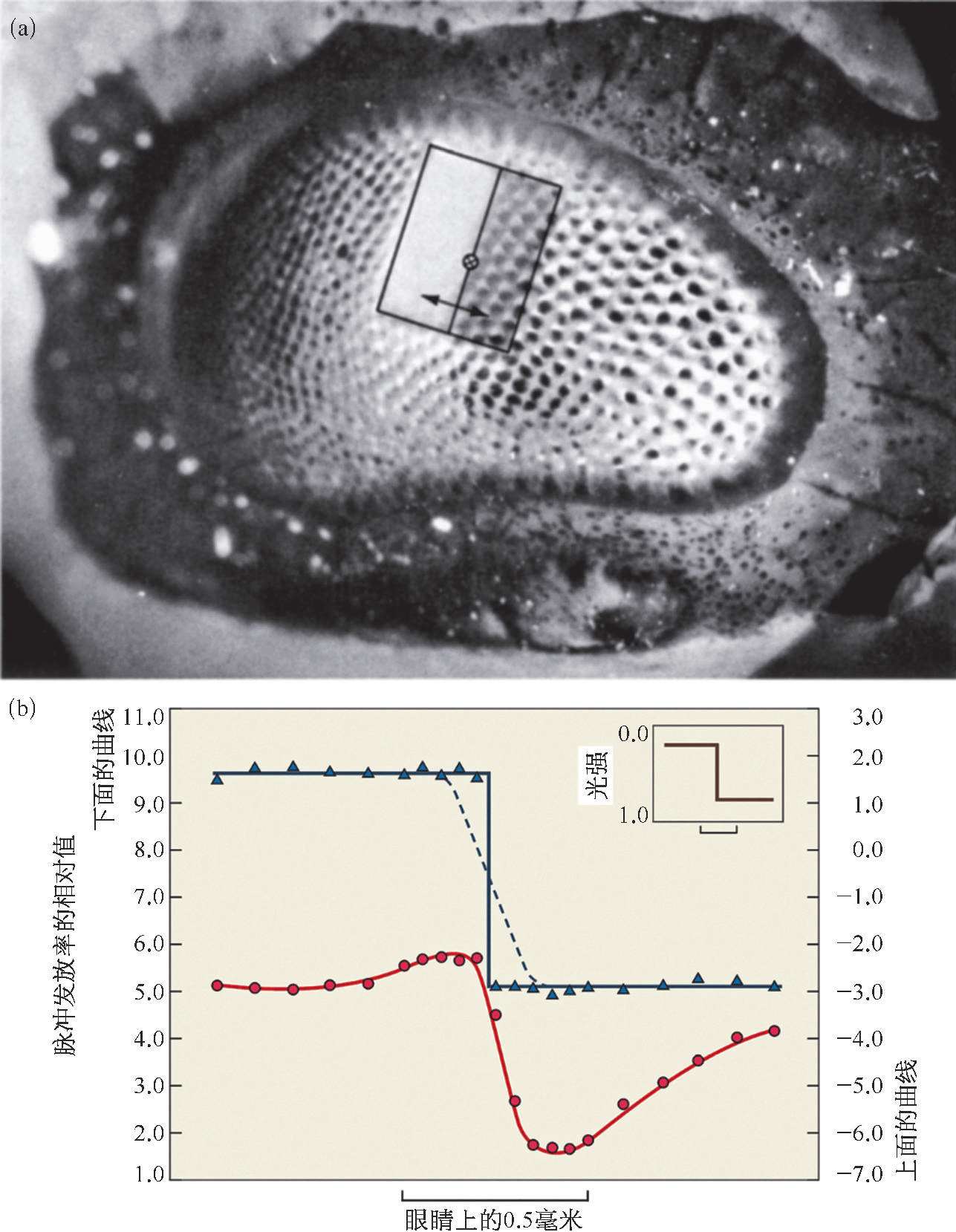 (a)在鲎复眼上加上有明暗对比的光刺激。(b)右上角的折线表示光刺激的光强变化,圆点表示这种光刺激所引起的各个小眼的脉冲发放率的实际测量值,圆点所在的曲线表示根据方程式计算得到的结果。如果每次仅暴露一个小眼,而把所有其余小眼都遮蔽起来,也就是说小眼没有受到附近其他小眼的侧抑制,在同样光刺激下测得的结果用三角表示,三角形所在的折线是计算所得的结果。虚线表示由于光感受器前面的曲光体(晶锥)对光线造成弥散,所以明暗分明的光线照射到复眼时,实际落在光感受器上的光分布在分界处形成一个过渡区,这就解释了为什么圆点和曲线在分界处不那么陡。