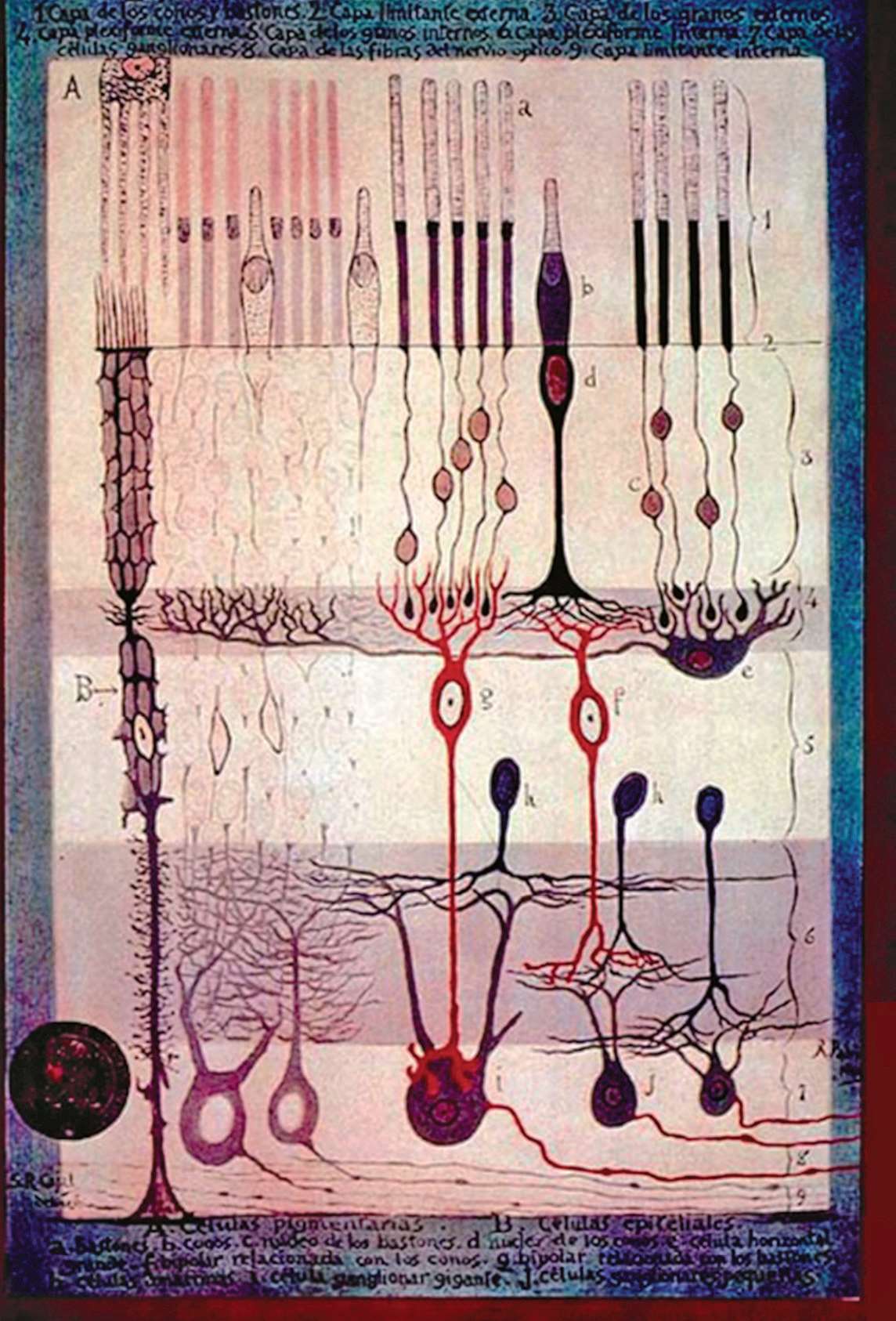 图 2.16 拉蒙— 卡哈尔笔下的视网膜解剖图