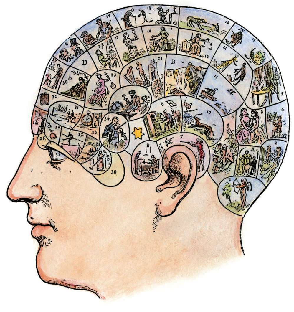 19 世纪初,奥地利医生加尔(Franz Joseph Gall)相信人不同的认知功能和性格特点是由不同脑区决定的(图 1.2),如果某种功能用得多,相应的脑区就会增大,对应于它的颅骨也会隆起,因此通过检查颅骨的隆起情况就可以确定该人的性格,后来人们把这个理论称为颅相学(phrenology)(图 1.3)。