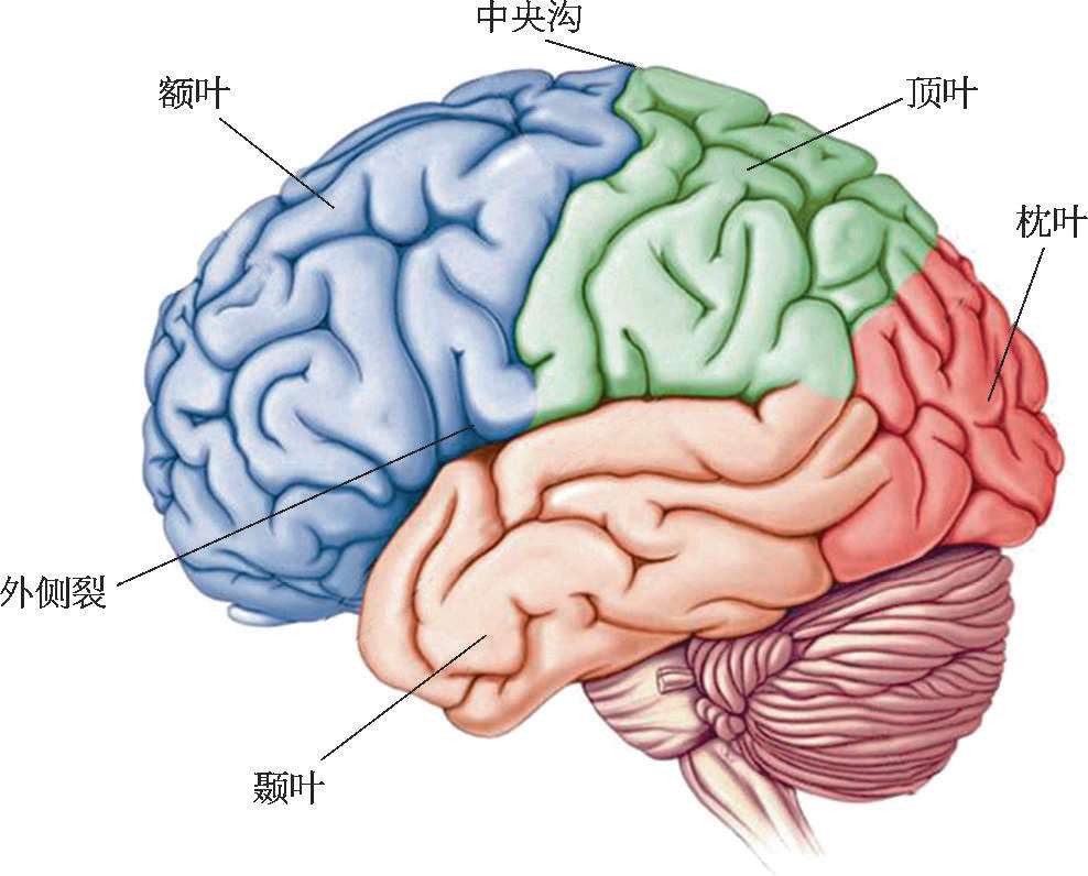 大脑皮层的表面有许多褶皱,鼓起的部分称为“回”,凹下去的部分称为“沟”,特别深的沟则称为“裂”,如把大脑分为左右两半球的沟就称为“纵裂”。正是这些沟裂把大脑表面分成许多不同的区域。大致地说,从皮层外表来看可分成 4 个区域:前端的额叶、顶部的顶叶、两旁的颞叶和后端的枕叶。