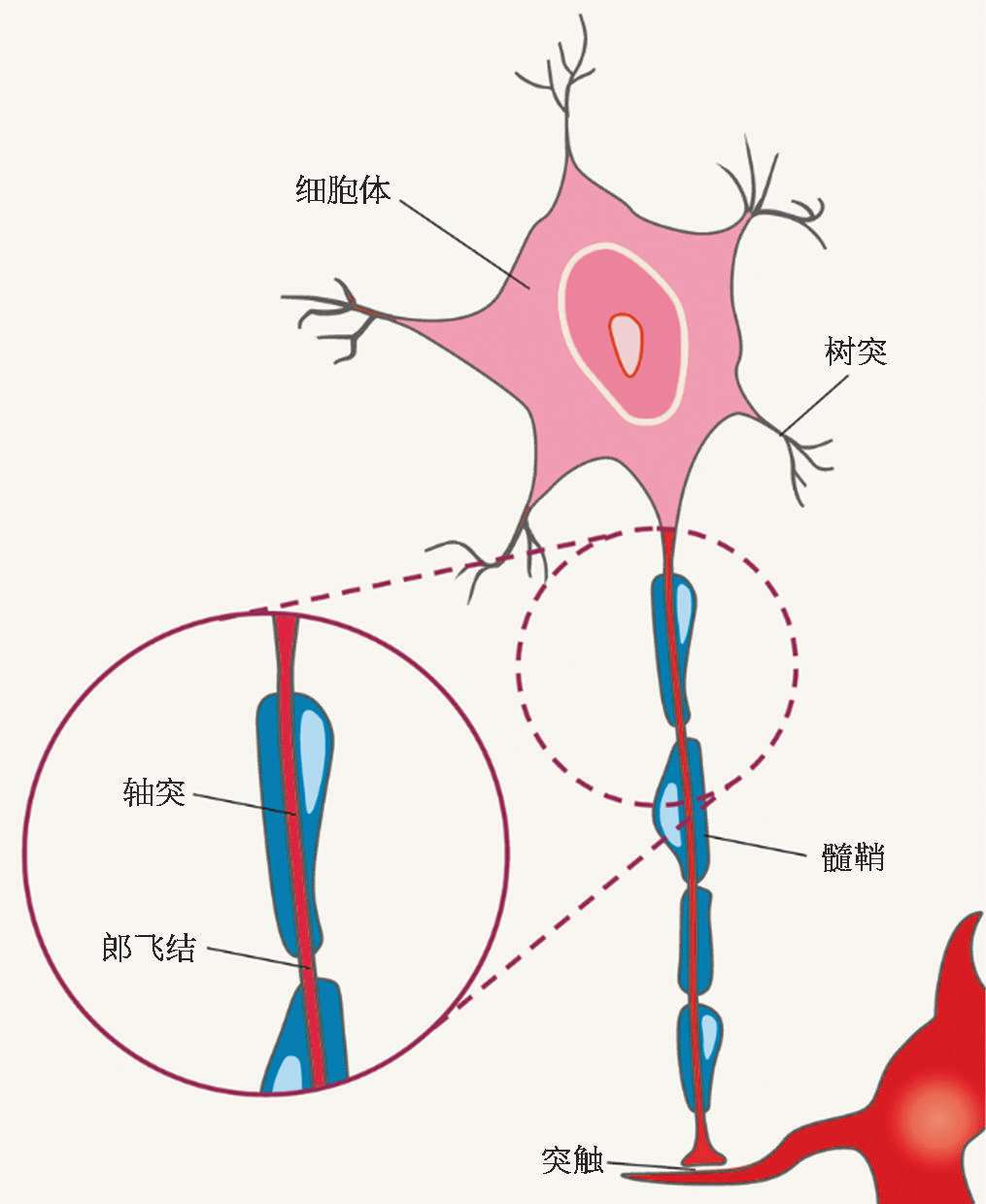 在轴突与细胞体连接的地方有一个锥形的结构,称为轴丘,是神经脉冲开始的地方。神经脉冲沿着轴突传导直至轴突末端,在末端上有一些膨起的结构称为“终扣”。这些终扣与下一个神经细胞的树突或细胞体或轴突邻接,这是不同神经细胞相互作用的地方,称为“突触”。