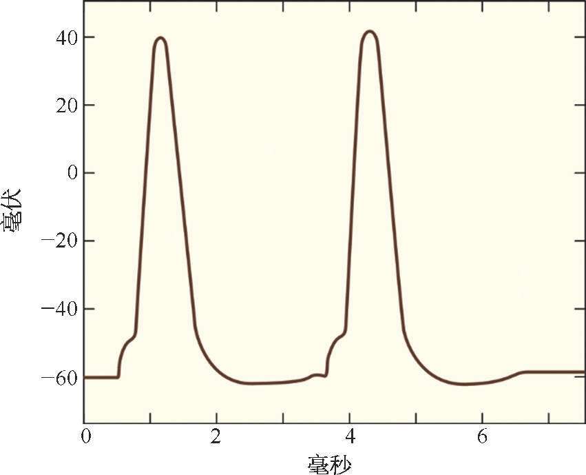 一处产生的动作电位会引起邻近有电压敏感离子通道的细胞膜上也发生动作电位,动作电位就在轴突上传播开来,传播的速度因轴突的不同而异,慢的每秒不到 1 米,而快的每秒可以超过 100 米。轴突变粗,或是包裹髓鞘都能加快传播速度。由于髓鞘的电阻很高,离子流倾向于通过邻近郎飞结处裸露的细胞膜形成回路(参见图 1.7),只要这个距离不太大,动作电位发生处的去极化电位衰减到郎飞结处依然超过阈值,就能在此引发动作电位的产生,这样,动作电位就好像在郎飞结之间不断地跳跃,这被被称为跳跃传导。不仅如此,动作电位在轴突上的传播还是单向的。在刚发生过动作电位的地方,对钠离子的通透性一下子跌到很低,而对钾离子的通透性却很高,产生动作电位的阈值大大抬高,因此动作电位只能向前传播,而不能反传回去。动作电位发生后的阈值升高期在科学上称为“不应期”。也由于上述这些原因,动作电位的形状和幅度都是固定不变的,这被称为动作电位的“全或无”定律。