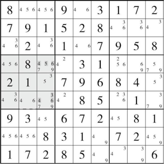 如盘面20(图5-1)所示,此时,我们发现,在宫4中,数字7和9可以出现的位置只剩下D3和F3。摒除后发现宫4内刚好只有两个单元格可以填入7和9这两个数字。这刚好满足数对的定义,所以这个格子内的其余填数情况将全部排除。因此,我们可以得到:D3<>{456}、F3<>{346},即D3={79},F3={79}。