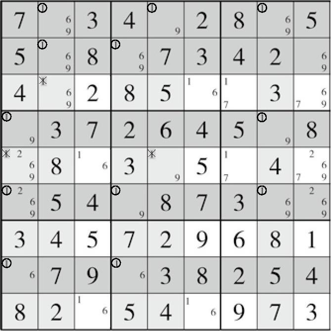 下面的盘面28(图6-6)将展示五链列的其中一个例子。数字1加叉号为被删除情况,数字1加圆圈为五链列,它也属于残缺的情况。不过,它可以转化成一个关于候选数1的三链列。