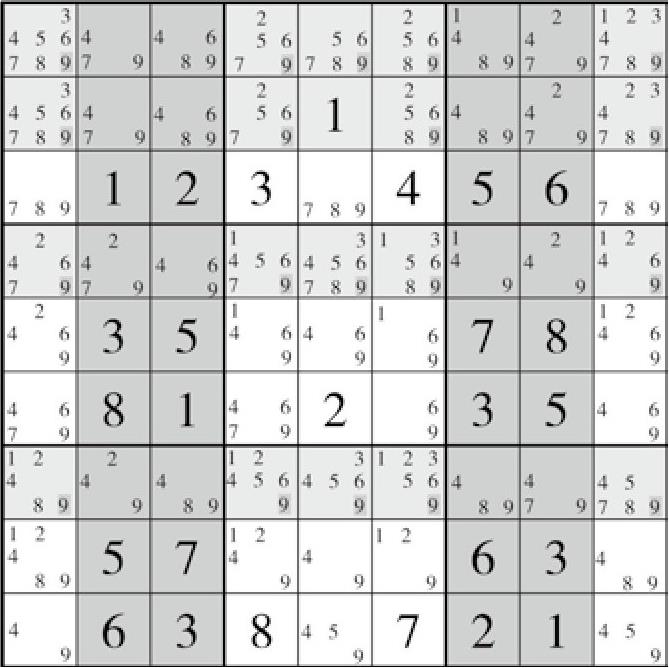 但是,四链列也同样具有部分单元格残缺的情况,一般来说,残缺的更为常见。如盘面27(图6-5)的这个残缺四链列结构:
