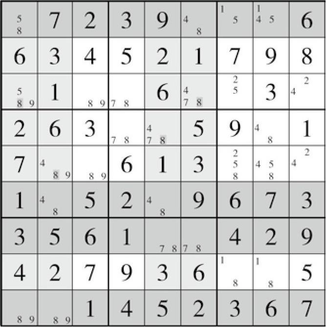如果A1=8,则I1<>8,则I2=8,F2<>8,则F5=8,G5<>8,则G6=8,A6<>8;反过来也就得到了I1、F2、G5、A6都为8了。但无论是哪种情况,列1、列2、列5、列6内都不得在其余单元格内出现8。因此删掉它们。