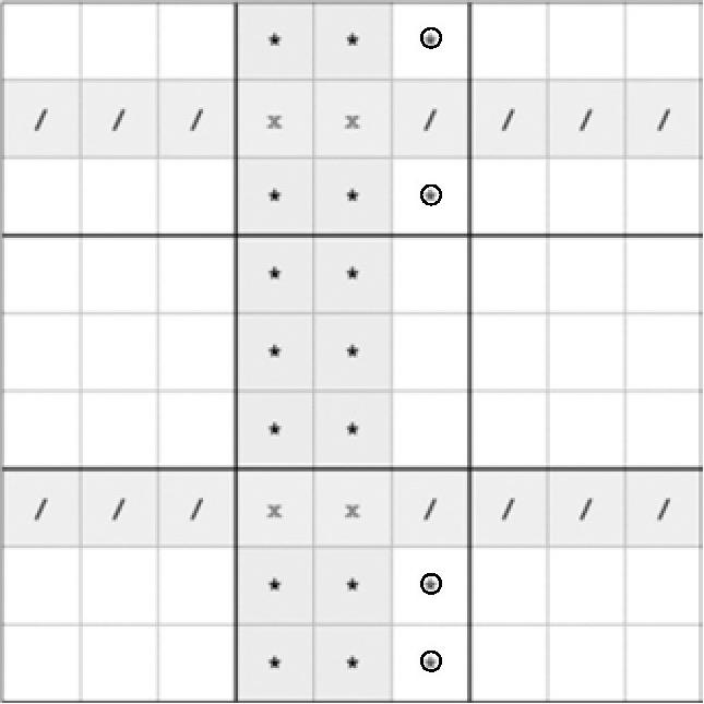 其中的“*”符号表示删数情况,“/”符号表示不含有某个候选数,而“x”符号表示含有某个候选数。