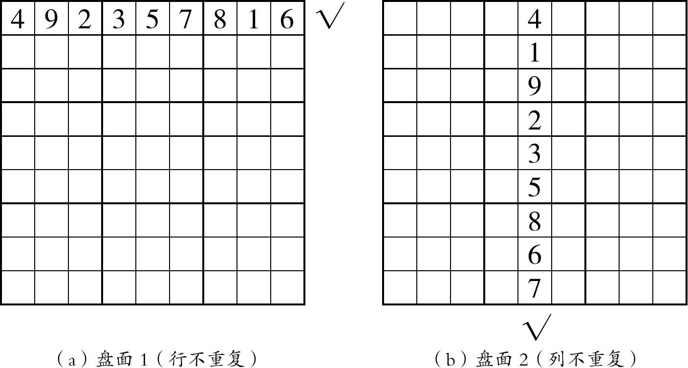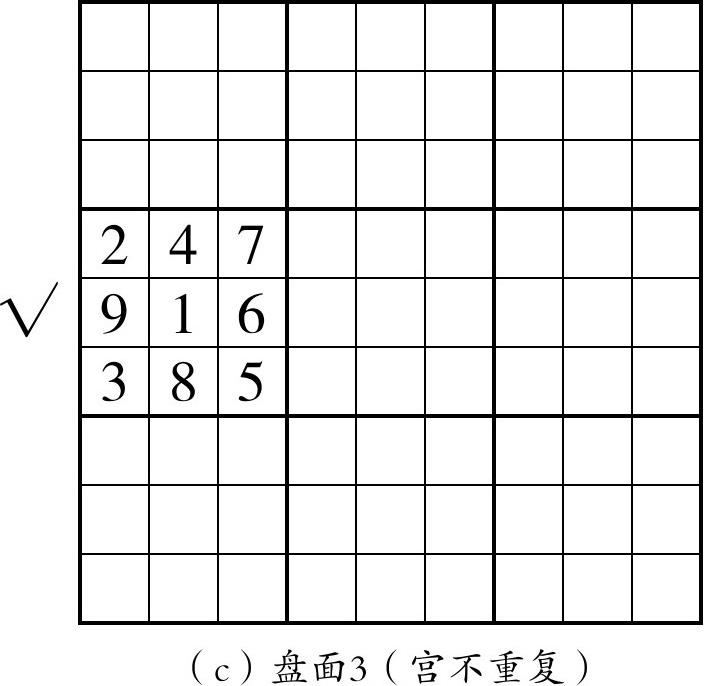 数独是一种有趣的益智游戏。它需要您在空格内填入1~9的其中任意一个数字,使得每一行、每一列以及每一个正方形的小九宫格内的数字都不重复。如下面三个数独盘面格子(以后均简称“盘面”)所示(图1-1),分别是行、列和小九宫格(以后均简称为“宫”)不重复的情况。