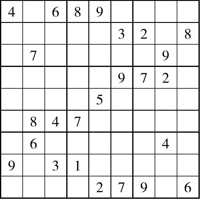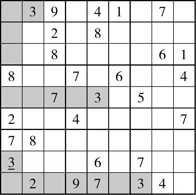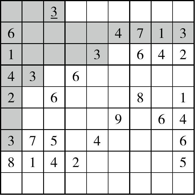 如盘面8(图2-3)所示。我们可以观察到,在列1中,数字3只能填在H1处。因为列1内有6个空格,而提示数3的位置使得A1、B1、C1、E1和I1这5格都不得填入3,因此3被“框”在了H1处。所以H1=3。