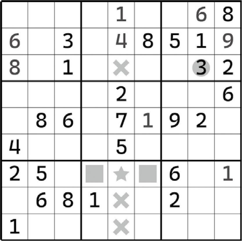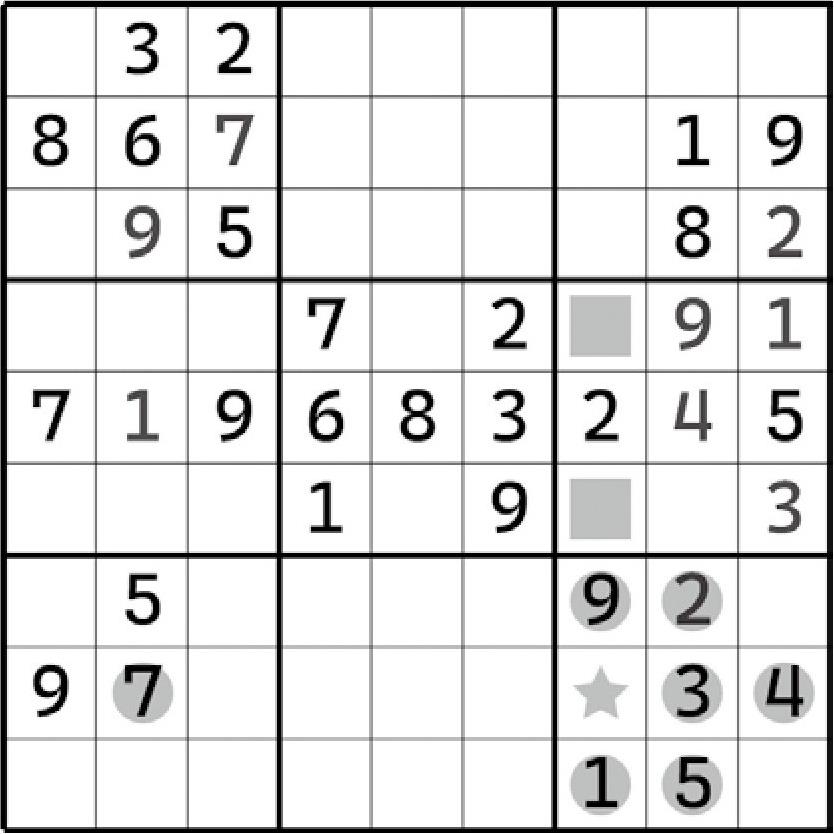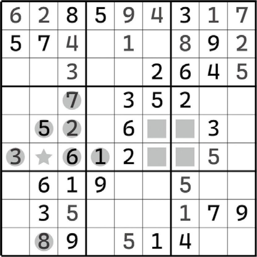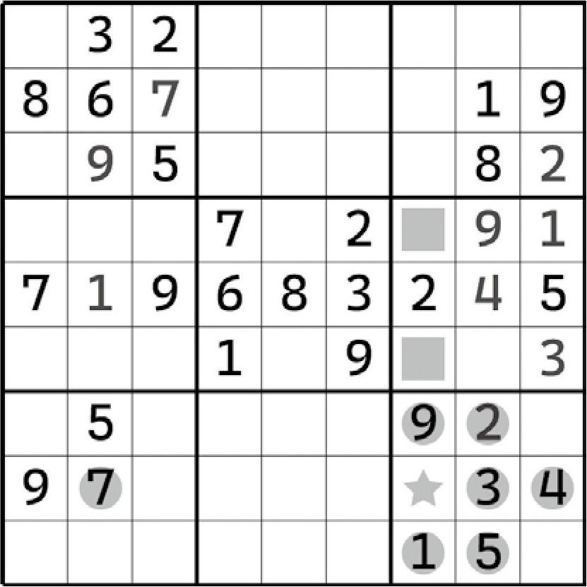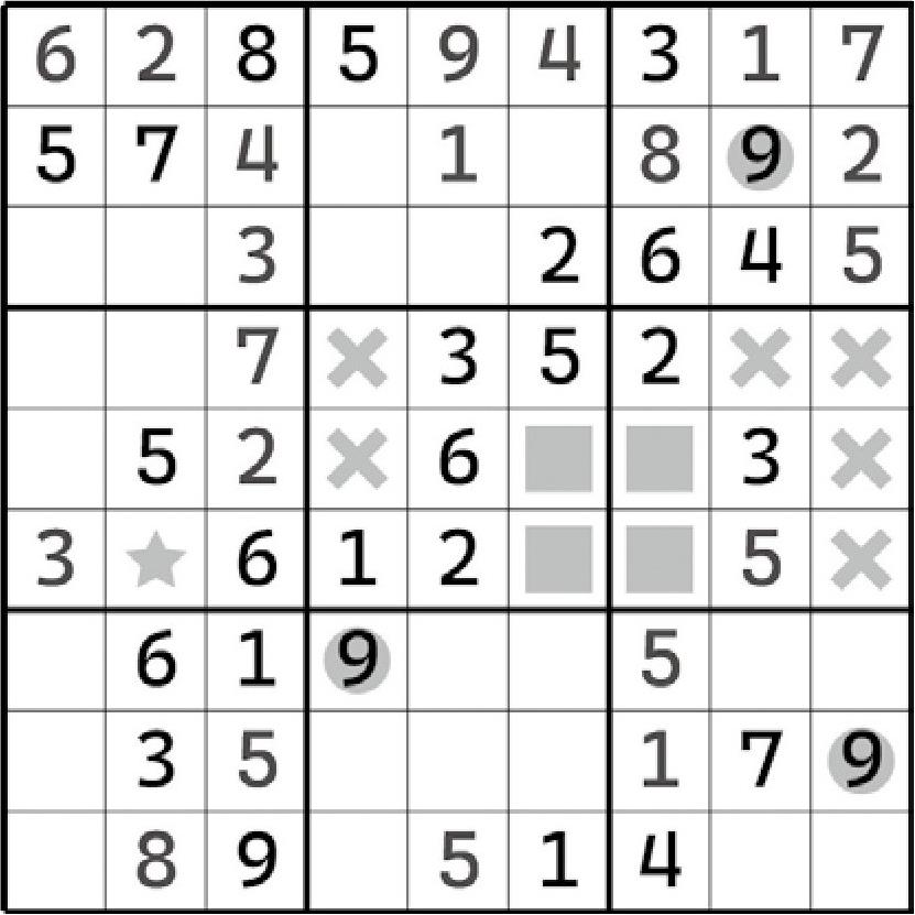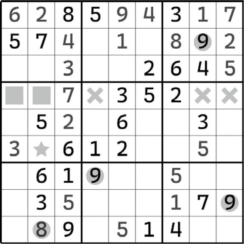 除此之外,别无其他。因为数独要求不能在同一行列上出现重复项,所以9在这两个宫区块里就只能放在“对角关系”的两个格子里。这里要注意一个小细节:区块结构最终是必须要有一个正确的数字填入进去的,所以两个宫区块应该必须有两个9的填入才是正确的。那么,两个9的摆放只能是斜着来了,否则一定会导致行或列出现数字9的重复项,违背数独规则。