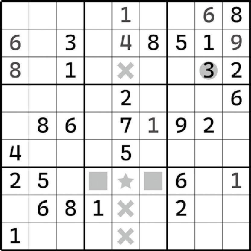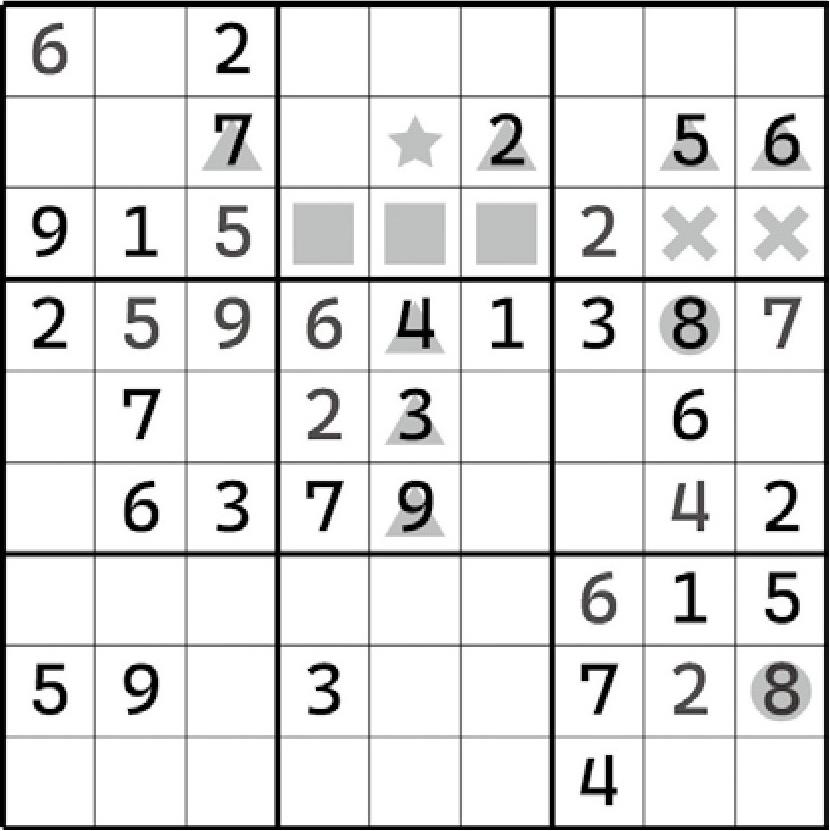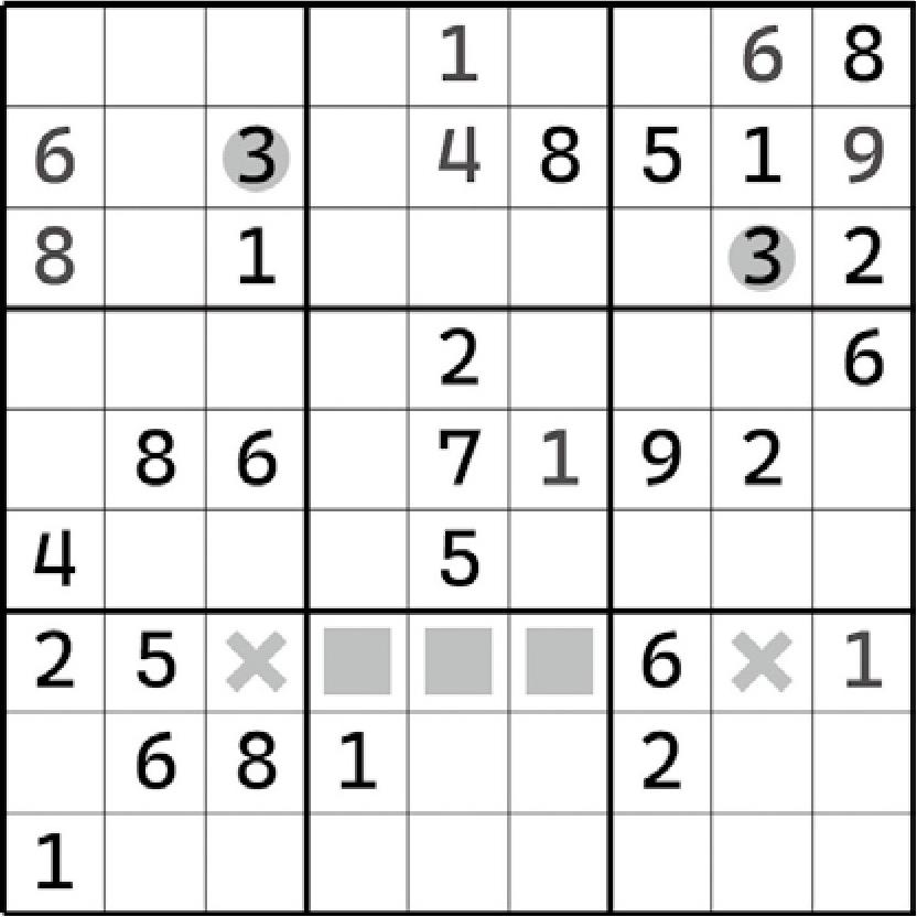 实际上,在前文举例说明的这些题目里,大家都可以发现一个基本的、相同的找寻规则——直接按排除法来找它们就行了。是的,区块结构的形成,实际上就是“模棱两可版”的排除法结论。只是,这样的区块结构可以更好地约束这些格子的填数,可以影响到别的区域。例如区块部分提到的第一个例子(上盘面):我们可以发现,虽然区块是从第6宫得到的,但是它影响到了第7列。