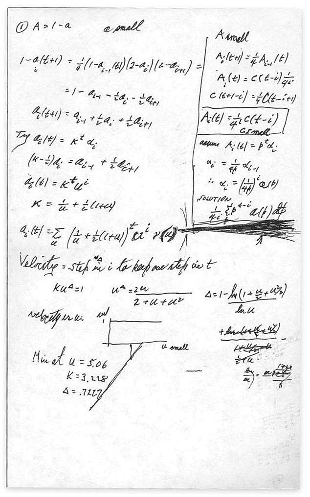 我一直觉得很不可思议。他会从某个问题开始,然后在几页纸上写满计算过程。最后,他真的会得到正确的答案!但他往往并不满足于此。一旦得到了答案,他就会回过头来,试图弄清楚为什么这是显而易见的。他经常会提出那种典型费曼式的、听起来简单合理的解释。他从不会告诉别人这背后所有的计算过程,有时候这对他来说有点儿像一个游戏:让人们被他看似瞬间产生的物理直觉震惊得目瞪口呆,却不知道实际上这些都来自他所做的一些漫长而艰难的计算。