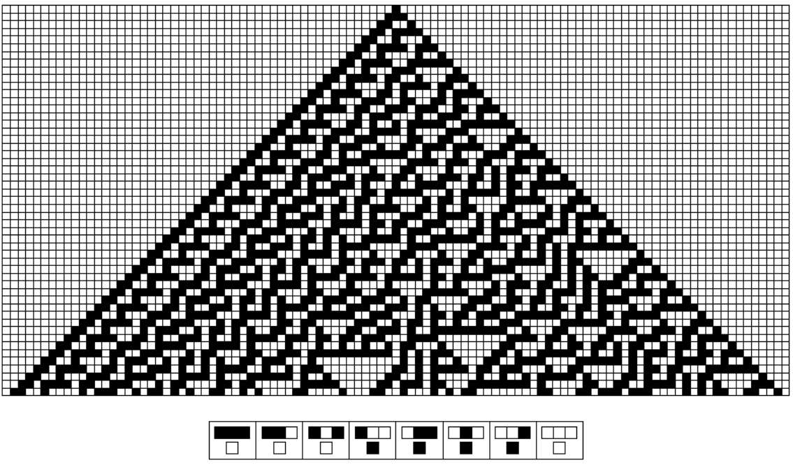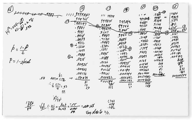 我和费曼又聊了很多关于规则 30 的东西。他真的很想对它的工作原理有一个直观的认识。他试着用所有常用的工具来不断地测试它,比如他试图找出秩序与混沌之间的那条线的斜率是多少。他还计算了一下,用了他常用的微积分等。他和儿子卡尔(Carl)甚至花了大量时间试图用计算机来破解规则 30。