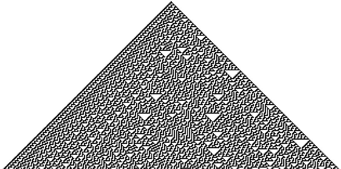 我们刚刚在其他人的帮助下,在地板上爬来爬去,试图用米尺把一幅规则 30 的巨型打印件上的一些特征测量出来。费曼把我叫到一边,神神秘秘地说:“听着,我只想问你一件事,你是怎么知道规则 30 会产生如此疯狂的结果的?”我说:“你了解我的,我并不知道。我只是让计算机尝试了所有可能的规则,然后我就发现了它。”他说:“啊,现在我感觉好多了。我还担心你有什么办法能把它搞明白呢!”