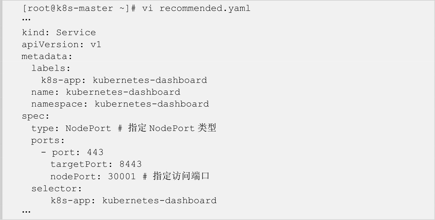 将Service的类型设置为“NodePort”类型并指定访问端口,以便将其暴露到集群外部进行访问,修改如下:
