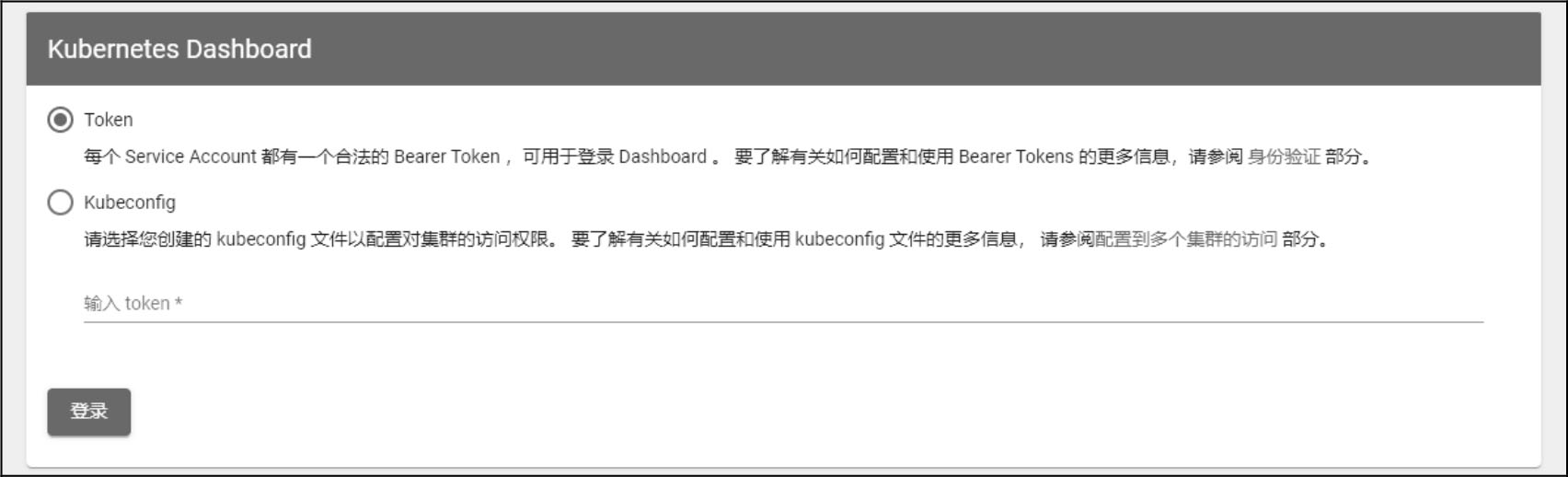 所有Pod的状态都显示为“Running”,说明Dashboard安装成功。在浏览器中访问“https://<节点IP地址>:30001”,你将看到登录页面,如图2-4所示。