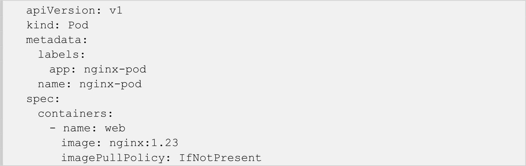 在上述配置中,“imagePullPolicy”字段的值为“IfNotPresent”,这表示创建Pod时优先使用节点上的“nginx:1.23”镜像。