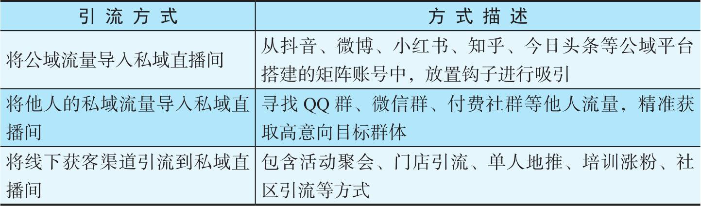 一是流量。要想解决直播间没流量的问题,在策划前期就要有意识地关注并提高直播间的点击率。常见的三种免费引流方式如表2-1所示。