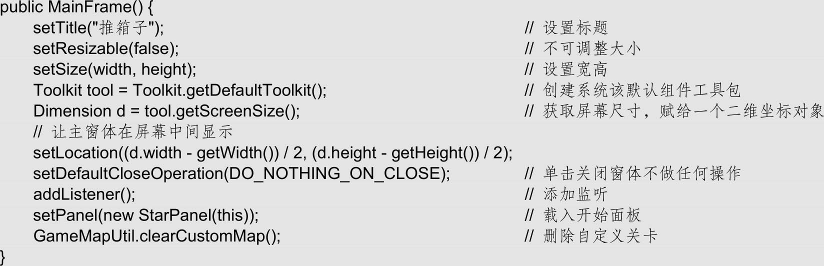 (3)编写主窗体的构造方法,在该构造方法中设置窗体的宽高、位置等属性。使用Toolkit工具类获取屏幕尺寸,并计算窗体居中显示的坐标。最后执行三步初始化本游戏的操作:添加监听、载入开始面板、删除自定义关卡。该构造方法的具体代码如下: