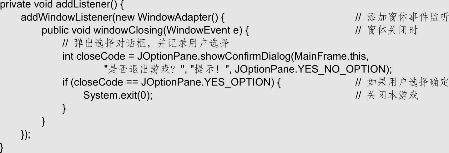 (4)构造方法中调用的addListener()方法用于为窗体添加监听,在该方法中为窗体添加了窗体事件,在用户关闭窗体时,会弹出选择框让用户确认关闭操作,如果用户选择“是”,则关闭本游戏,否则不做任何操作。这种确认关闭的功能可以防止用户误关闭本游戏。addListener()方法的代码如下: