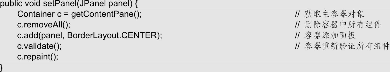 (5)构造方法中调用的setPanel()方法是用于切换游戏场景的关键方法。该方法中的panel参数就是要显示的面板,传入panel之后,主窗体会获取主容器对象,然后删除容器中已存在的所有组件,最后重新将panel放入容器中并重新进行校验、显示。这样就完成了场景切换的功能。setPanel()方法的代码如下: