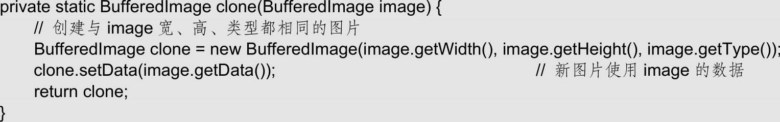 clone()方法的参数是被克隆的图片对象。此方法会创建一个新图片,其宽度、高度和类型都与原图片相同。然后,通过setData()方法,新图片使用原图片的数据。因此,新图片是一个独立的图片对象,其画面与原图片完全一致。