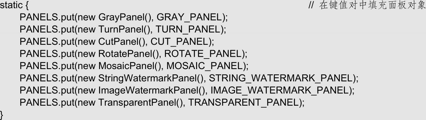(2)由于静态常量不可以在构造方法中进行初始化操作,因此本类使用静态代码块注册所有功能面板,代码如下: