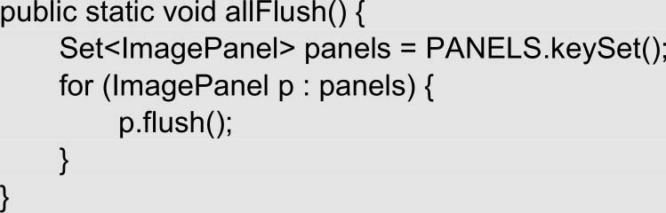 (4)当用户处理完一张图片并单击“应用”按钮后,所有功能面板都应该重新加载这张修改后的图片。因此,需要提供一个让所有面板都立刻刷新的方法。allFlush()方法就用来刷新所有已注册面板的方法,该方法会遍历所有功能面板,并依次对每个功能面板执行flush()方法。该方法的代码如下: