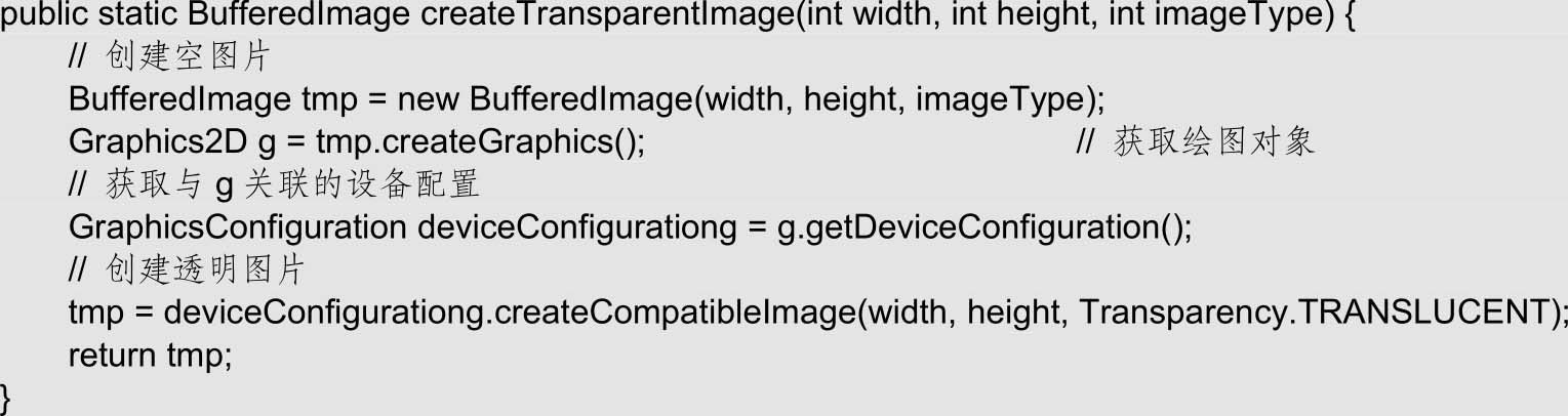 (6)由于PNG格式的图片可能包含透明区域,在程序对图片进行旋转、翻转或透明化处理时,需要保留原图的透明区域。然而,BufferedImage的默认背景是黑色的,这可能会导致透明区域被错误地填充为黑色。为了避免这个问题,MyImage类提供了一个名为createTransparentImage()的方法,用于创建一个具有全透明背景的图片。该方法接收三个参数:图片的宽度、高度和图片类型。该方法利用GraphicsConfiguration设备类来创建一个全透明的图片,并返回这个新创建的图片对象。