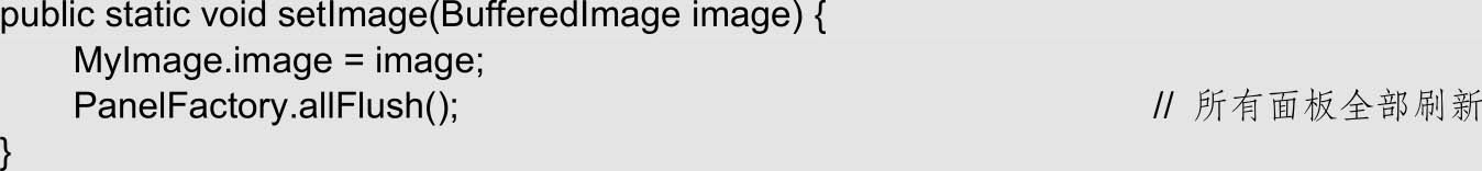 (5)若用户在修改图片后决定保存修改,那么程序需要将原始图片替换为修改后的图片,也就是替换image对象的值。为此,image属性提供了一个标准的setter方法。在替换原图的过程中,程序还会调用面板工厂类的allFlush()方法,以刷新所有面板,确保它们都显示用户修改后的图片。setter方法的代码如下: