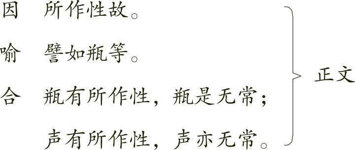 右例,最初一段曰“宗”,以次而“因”,而“喻”,而“合”,而“结”。“宗”者,立言者意旨之所在,乃议论之主题也。“声是无常”云者,即立言者所主张之宗义,首宜揭之,以为彼我间议论之标的者。顾主张之矣,而为论敌所弗首肯,则立言者须示其所以主张之理由,是为“因”。第二段“所作性故”云者即尸此。以声之起色,由于因缘之和合,而有“所作性”,本是以为其无常之理由,因以立其宗也。然而以声之有“所作性”为无常之理由矣,而仅漠然言之固不可;须有物焉,实为有“所作性”而无常者以证之,则“喻”是。第三段“譬如瓶等”云者,所以揭其例也。夫有其理由矣,更取譬喻于一物而证明此理由,使为论敌者,据现有之事实,而悟夫声之以“所作性”而无常矣。至此,唯有引瓶等等与声而合之,以见夫后者之为物,其“所作性”与无常之关系,与前者正等。故第四段合之曰“瓶有所作性,瓶是无常;声有所作性,声亦无常”。过此以往,则议论已定,而可有以“结”之。故第五段“是故……亦无常”云者,则所以结其说也。