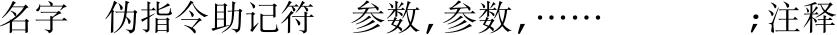 ● 表示汇编程序命令的语句称为说明性(指示性)语句。说明性语句指示源程序如何汇编、变量如何定义、过程如何设置等。相对于真正的处理器指令(也称为真指令、硬指令),汇编程序命令也称为伪指令(Pseudoinstruction)、指示符(Directive)。说明性语句的格式如下: