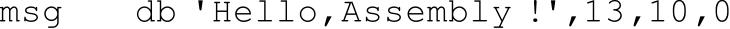 伪指令的参数可以是常量、变量名、表达式等,可以有多个,参数之间用逗号分隔。例如,在“'Hello,Assembly!',13,10,0”示例中,参数包括用单引号表达的字符串“Hello,Assembly!”、常量13和10(这两个常量在ASCII码表中分别表示回车和换行控制字符,其作用相当于C语言中的“\n”)、一个数值0(作为字符串结尾)。