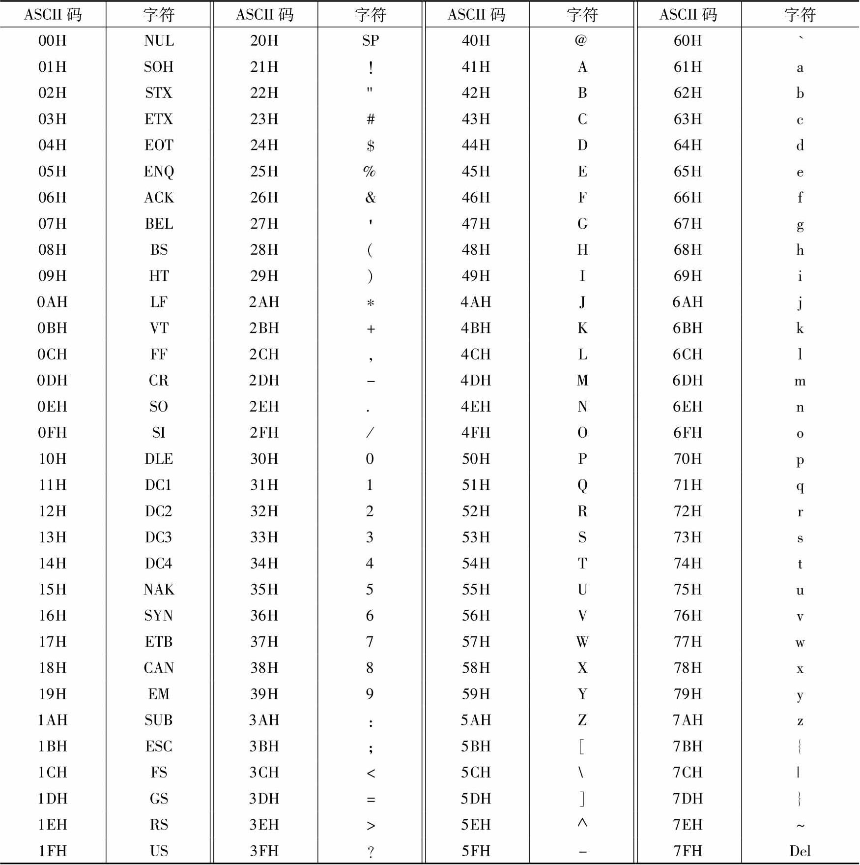 ASCII码表中从20H开始的95个编码是可显示(打印)的字符,其中包括数字(0~9)、英文字母、标点符号等。从表中可看到,字符'0'~'9'的ASCII码为30H~39H,去掉高4位(或者说减去30H)就是BCD码。大写字母A~Z的ASCII码为41H~5AH,而小写字母a~z的ASCII码为61H~7AH。大写字母和对应的小写字母相差20H(32),所以大小写字母很容易相互转换。ASCII码中,20H表示空格。尽管它显示空白,但要占据一个字符的位置;它也是一个字符,表中用SP(space)表示。熟悉这些字符的ASCII码规律对解决一些应用问题很有帮助,例如,英文字符就是按照其ASCII码大小进行排序的。