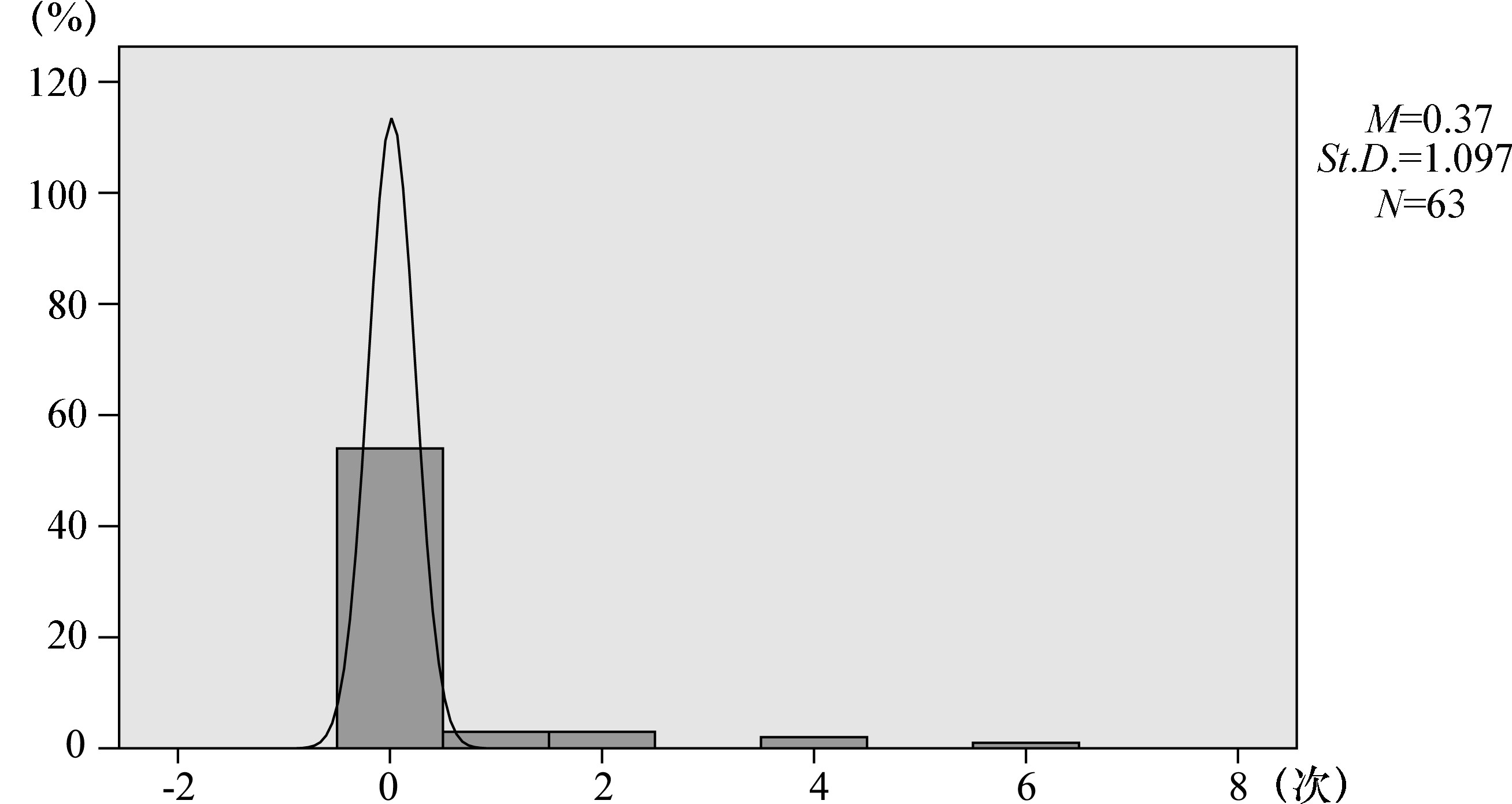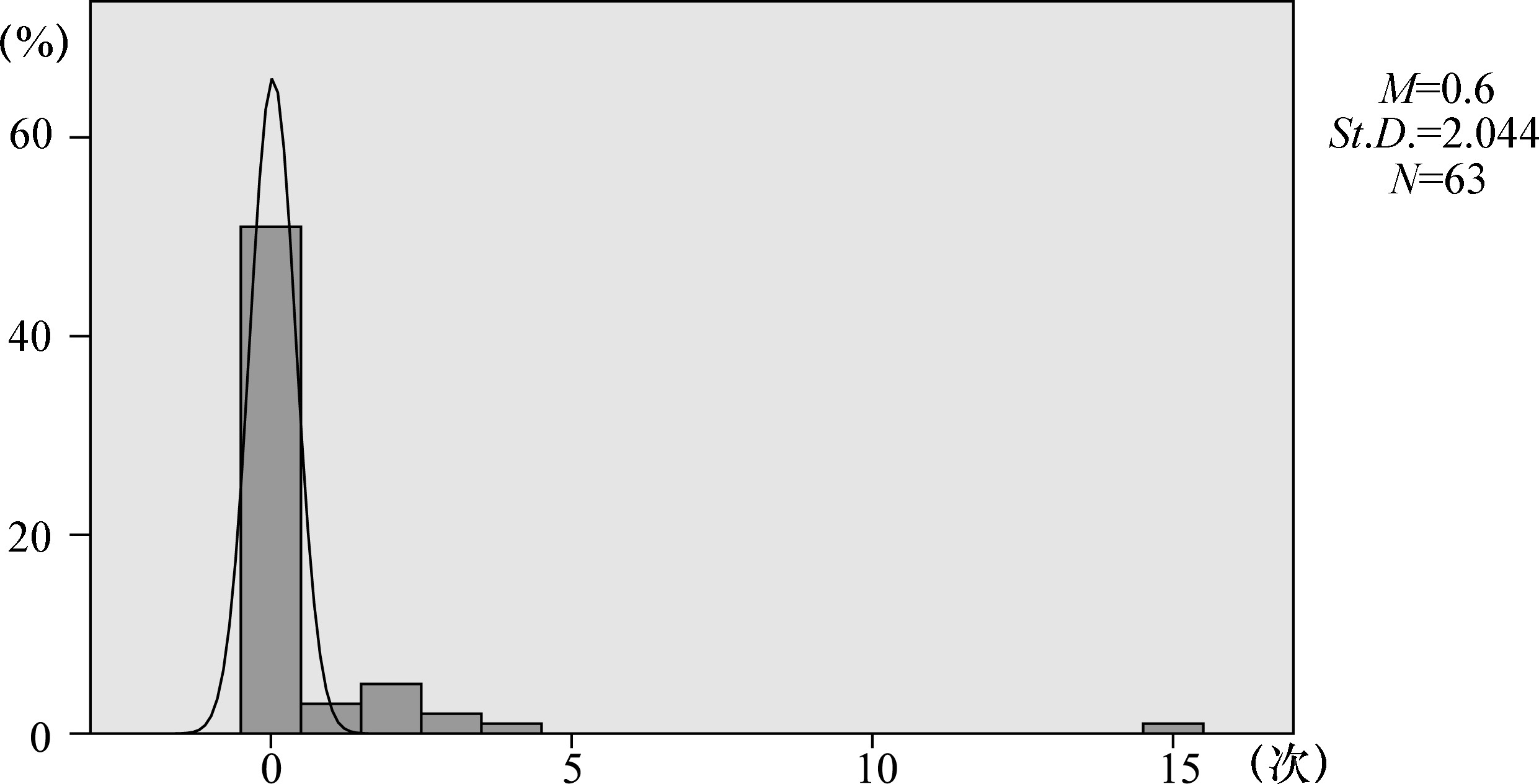 其次,在干群纠纷方面(见图1-8),村庄中发生的此类纠纷更少,一年平均发生0.37次,比计划生育纠纷少。在63个有效个案中,有54个村庄没有发生干群矛盾,达到85.7%。这一结果也较为符合农村现实,因为自2006年中央政府取消农村税费之后,村干部不再履行收税费的职能,而是转向执行上级政府的惠农政策的职能,即从“索取者”角色转换为“施予者”角色,村干部这种角色的重大转变无疑也消除了许多以往因收税费而与村民发生的纠纷。