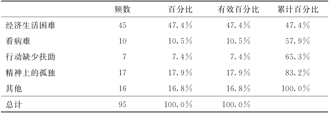 有47.4%的村庄报告农村老年人最大的困难是经济生活困难,表明老年人的经济支持问题在农村较为普遍存在。经济生活困难之所以成为农村老年人老年生活中最大的问题,是因为城市老年人大多有退休金或养老金,而农村老年人在不能从事农业生产劳动以后,除政府的少量补贴之外,就没有任何经济收入了。因此,在经济上他们只能依靠家庭或子女的支持,一旦这一经济支持受阻,老年人的生活就会陷入困境。尽管多数农村家庭承担了养老义务,但家庭养老毕竟属于非制度性的养老模式,难以排除因家庭差异而产生的老年人生活质量低下问题。所以,对于农村老年人来说,他们最担忧的还是养老的经济支持问题。