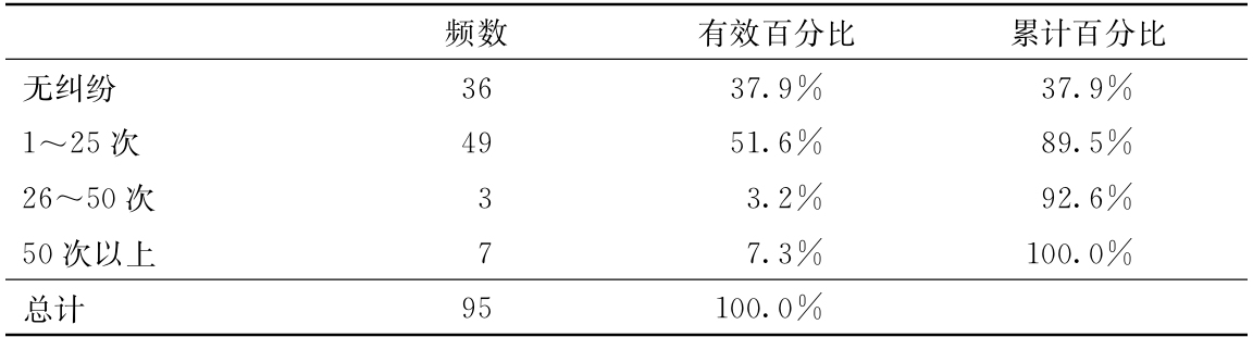 表1-20是对95个村庄干部就12类纠纷而进行的问卷调查的统计分析结果。从数据来看,村庄一年内发生的矛盾纠纷次数平均为17.7次,标准差为49.7,说明村庄之间差异很大。具体来看,没有发生矛盾纠纷的村庄占37.9%,即超过1/3的村庄其实并未发生过矛盾纠纷事件。发生纠纷次数在1~25次的村庄占51.6%,发生纠纷次数在26次以上的为10.5%,如果把每月发生2次以上矛盾纠纷的村庄视为矛盾纠纷频发村,那么这样的村庄也不过10%左右。