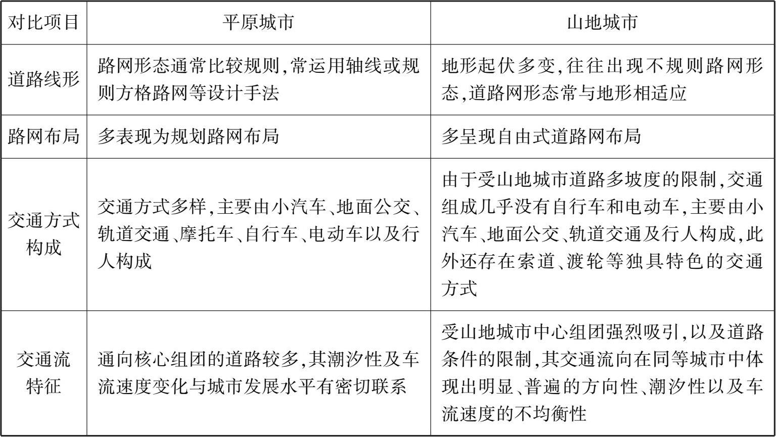 表 1.1 山地城市与平原城市交通特征对比
