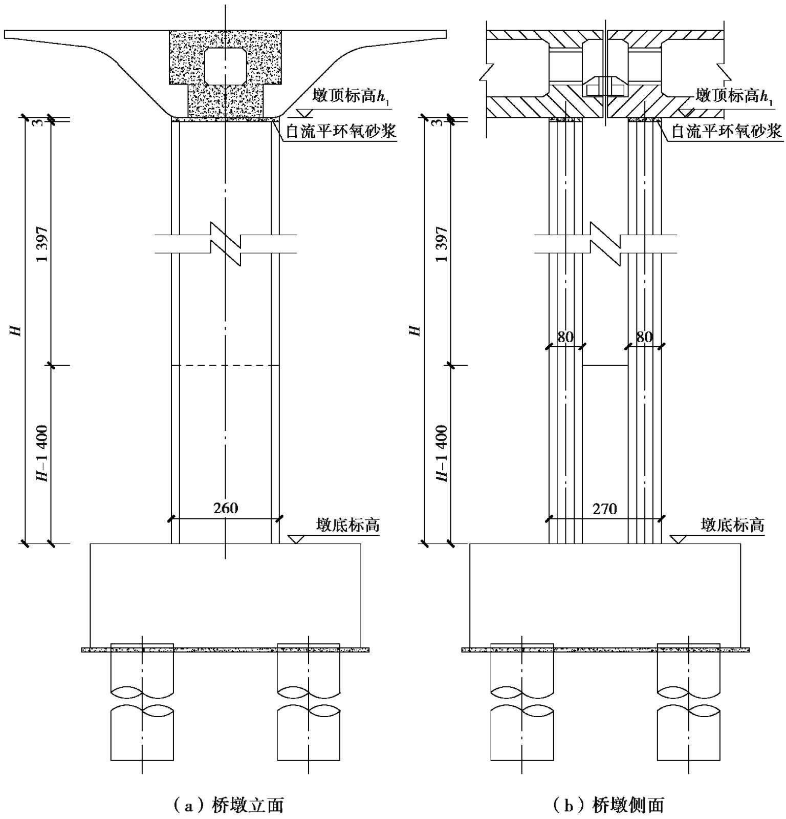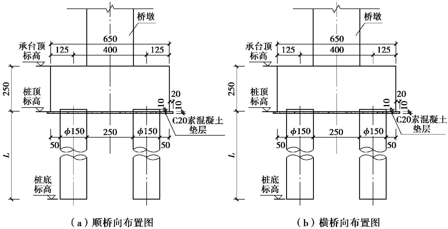 承台采用钢筋混凝土。基础采用钢筋混凝土,群桩基础形式,单个承台下设置 2根桩基础,基础按照摩擦桩进行设计。现浇混凝土桥墩具有技术成熟、可靠性高、抗震性能优良、施工难度低、投资省的优点,推荐采用。