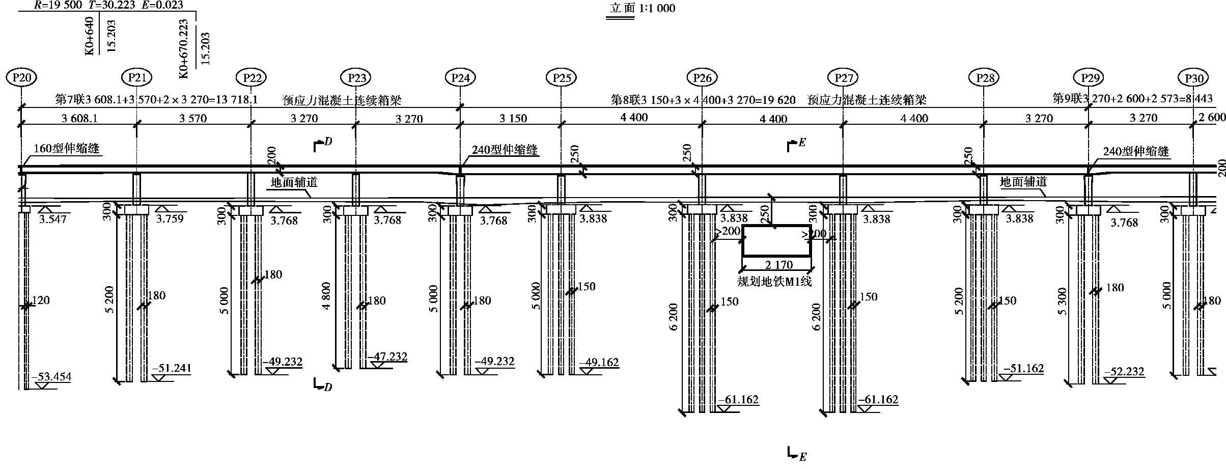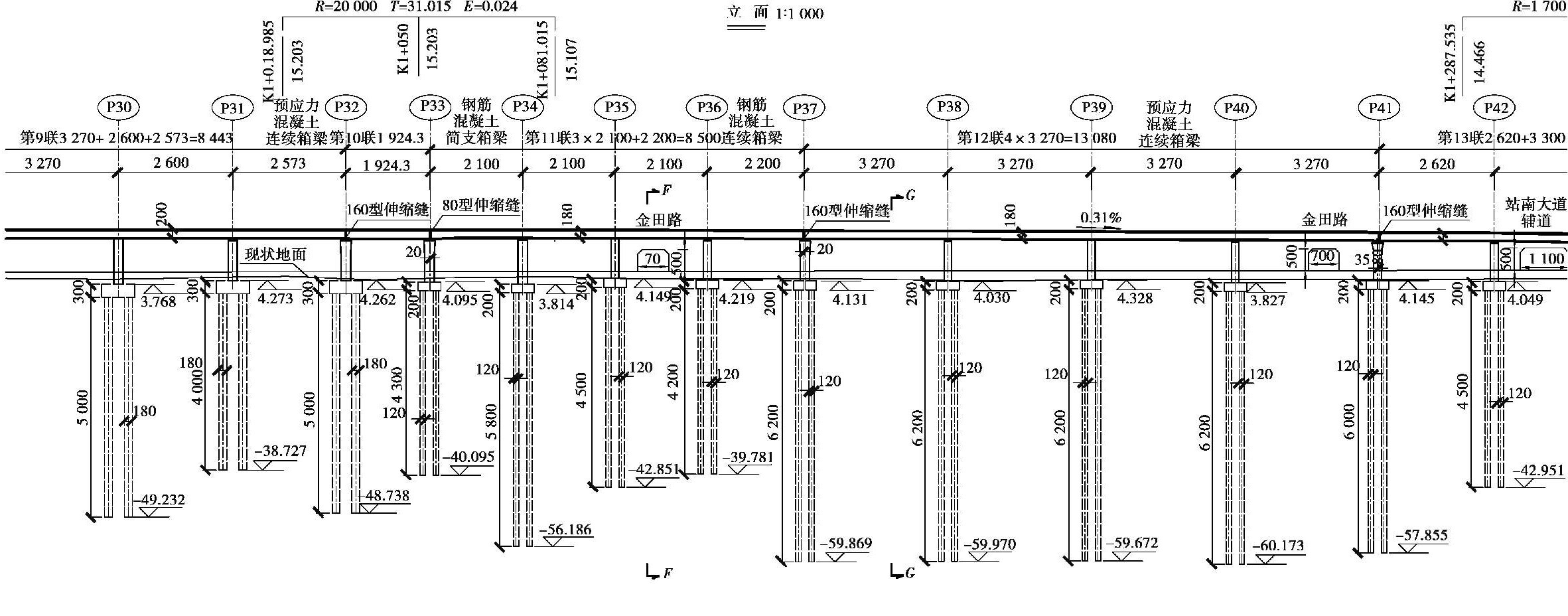⑥高架区间标准梁采用花瓶墩形式,根据全线地质情况,采用桩基础作为本段桥梁的基础形式,桩底置于下部承载力较高的地层内。采用钻孔灌注桩,一般桥梁钻孔桩直径采用 ϕ 1.0~1.5 m,大跨特殊结构钻孔桩直径采用 ϕ 1.5~2.5 m。