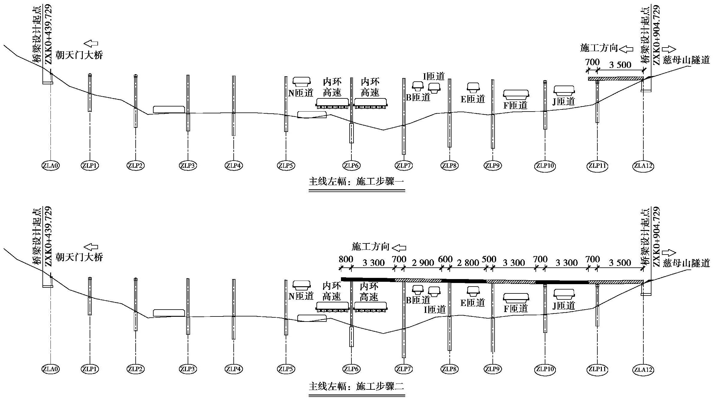 ⑤机场快速通道跨越内环高速,采用钢盖梁门架和吊装施工。