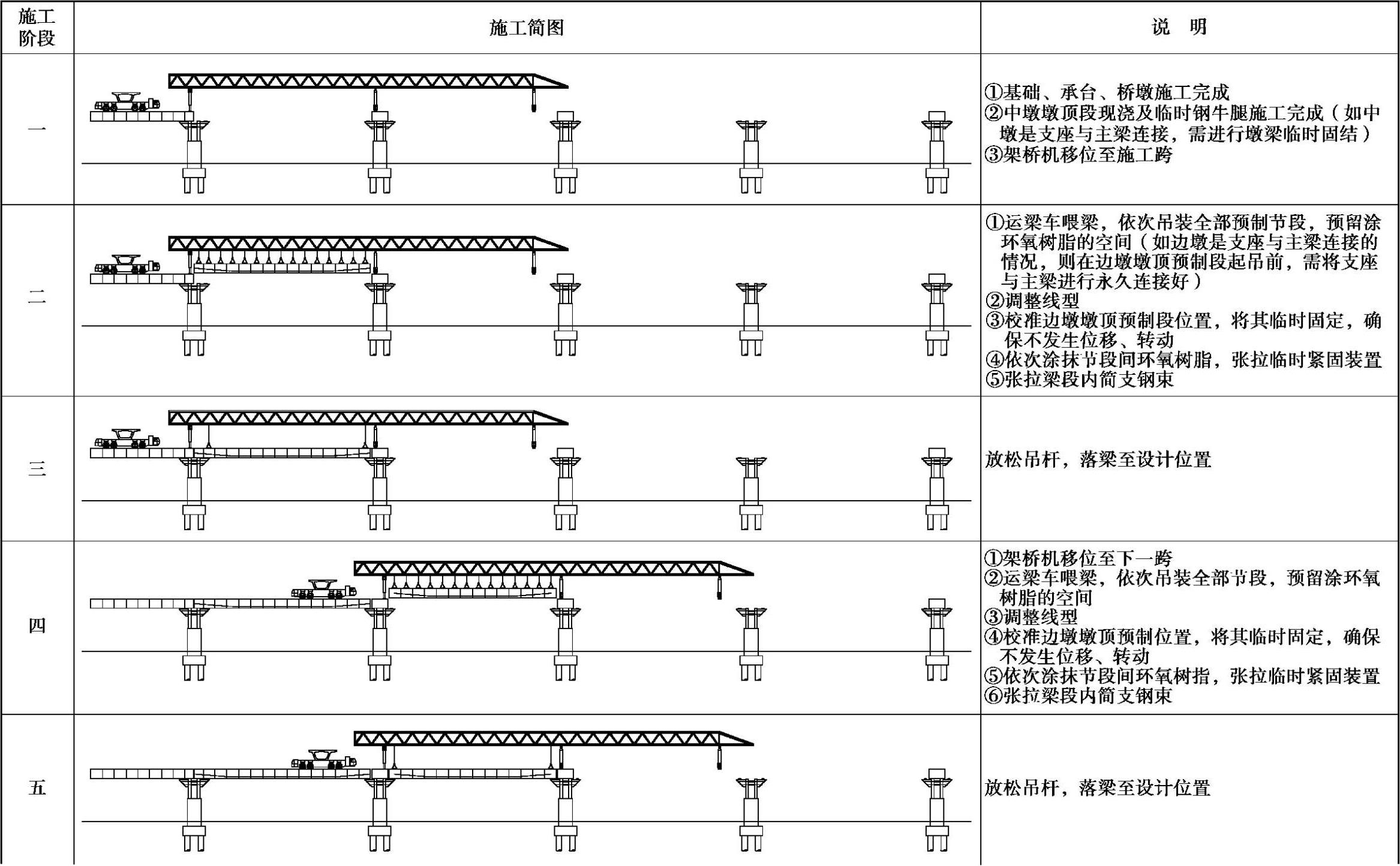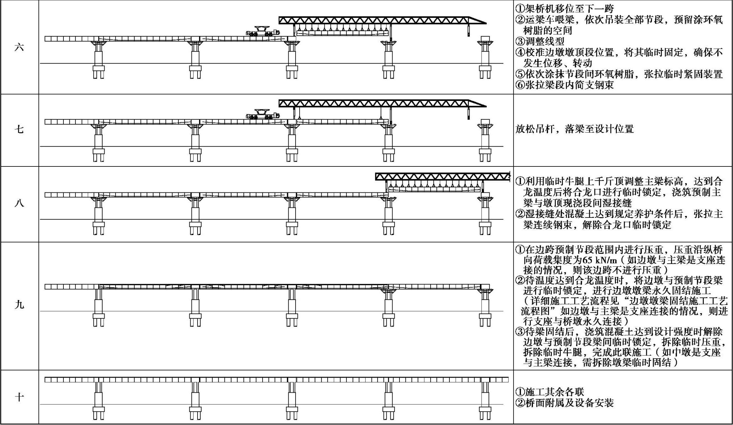 在上部节段预制箱梁施工工程中,各跨需要先在架桥机形成简支状态、落梁至临时支架、架桥机行走、该联各跨均放置在临时支架后再浇筑湿接缝、张拉合龙钢束、最后浇筑边墩墩梁固接混凝土成桥,施工工程中体系转换多。