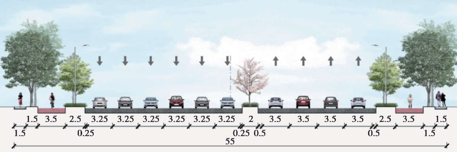 江东大道呈南北纵向穿越马鞍山市,是马鞍山市主城区规划路网“五横一纵”中的一条重要的主干道,是城市绿化的景观风貌的景观大道之一,是城市对外交通的主要纽带之一。江东大道设计车速为 60 km / h,标准路幅宽为 60 m,具体横断面布置为:5.5 m(人行道)+5.5 m(非机动车道)+3.0 m(机非分隔带)+12.0 m(机动车道)+8.0 m(中央分隔带)+12.0 m(机动车道)+3.0 m(机非分隔带)+5.5 m(非机动车道)+5.5 m(人行道)= 60 m。南京至马鞍山城际铁路(马鞍山段)与江东大道的横断面关系如图2.47 所示。