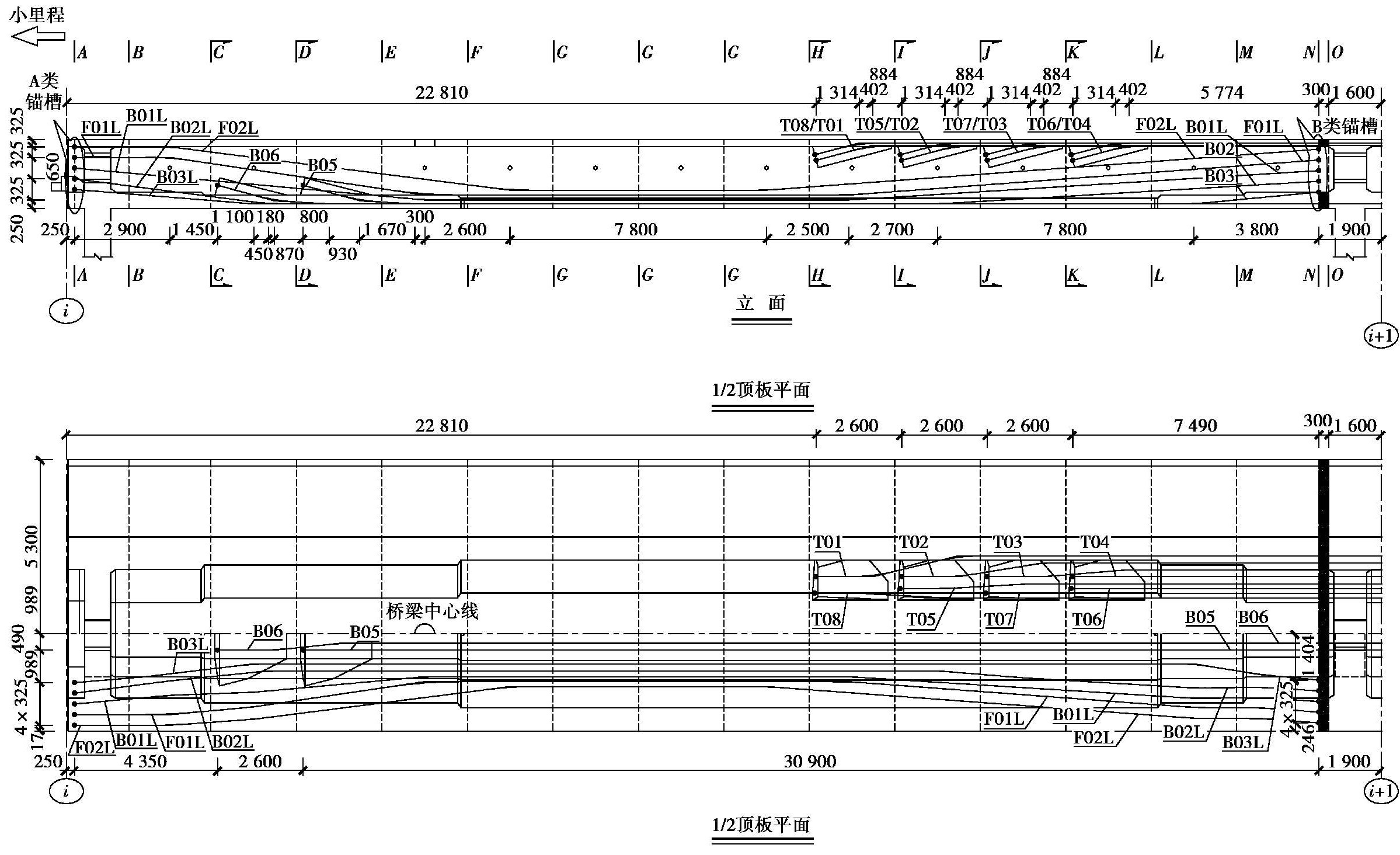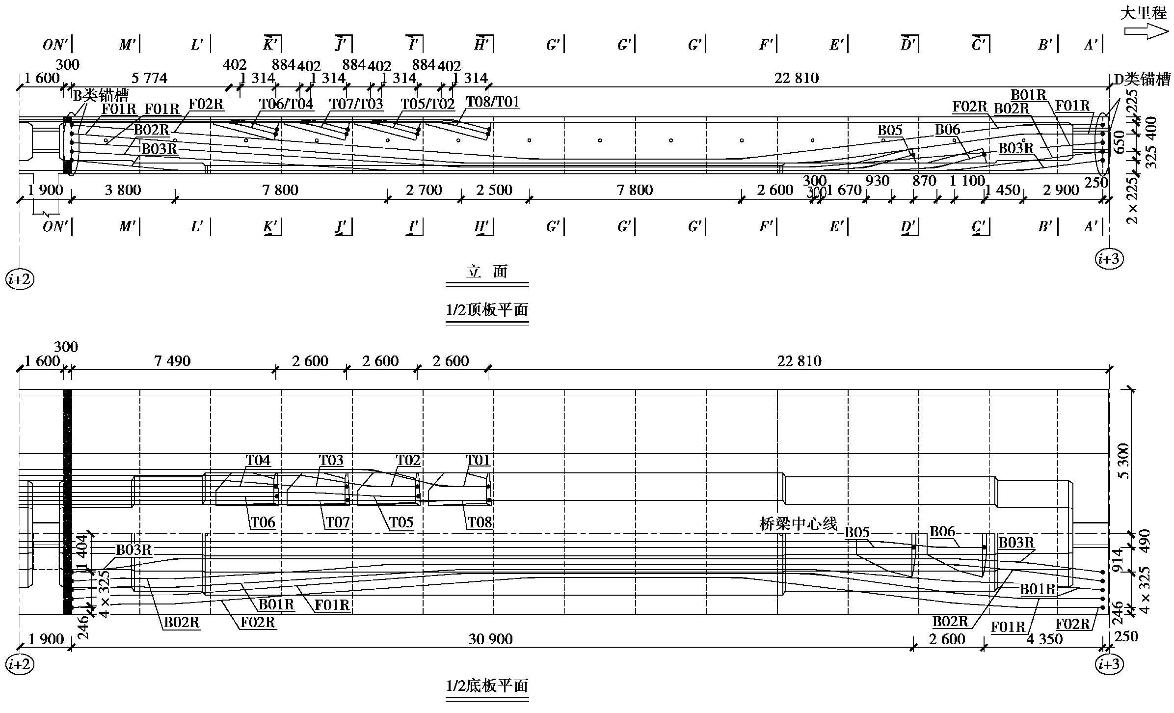 图 2.54 1/2预应力钢筋力面布置图(单位:cm)