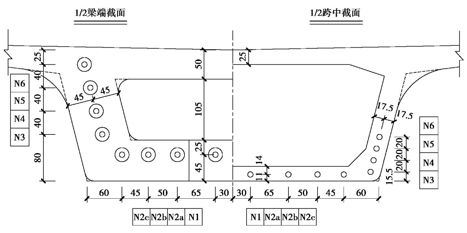 由于呼和浩特市处于严寒地区,昼夜及季节性温差都较大,如果采用结构简支、桥面连续的形式,结构缝较多,后期由于温差造成的铺装开裂现象将会非常明显,影响桥梁的行车舒适性及观感。因此,呼和浩特市三环路高架桥采用先简支后结构连续预制小箱梁,尽量减少结构缝,从而避免结构缝处的铺装由于温差效应开裂。先简支后结构连续箱梁由于存在较大的负弯矩,往往在腹板变厚段的下缘压应力过大,在负弯矩钢束张拉位置的顶板上缘拉应力较大。针对连续梁的这一受力特点,将跨中外的钢束尽量上抬,以改善截面上、下缘的受力。