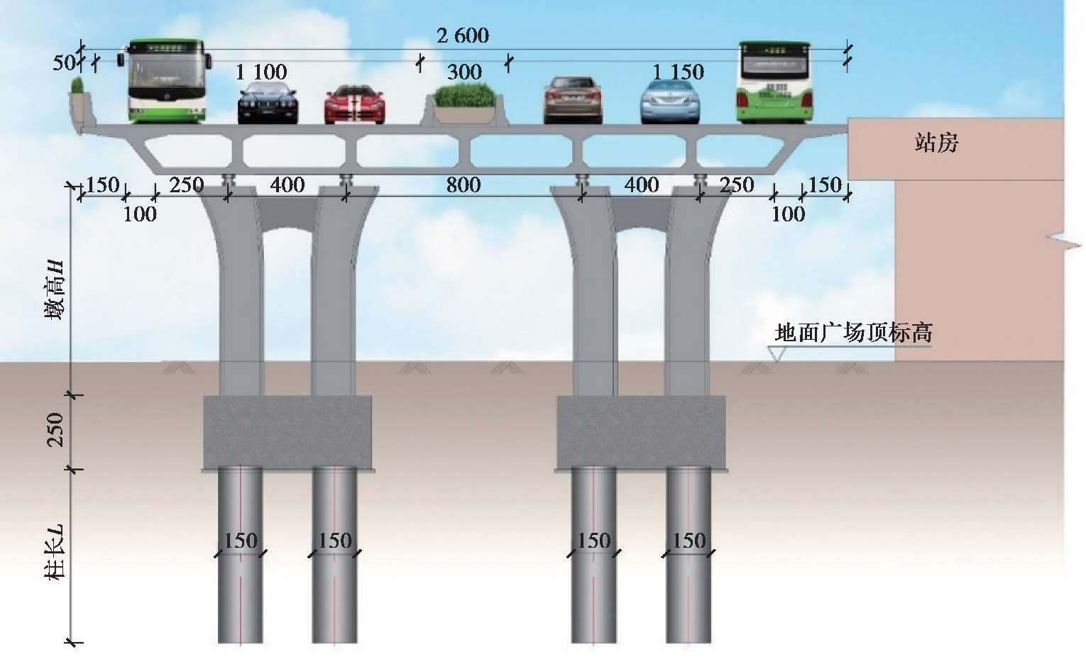 高架桥梁标准段和上跨交叉路口的节点桥下部结构采用带伸臂的门形框架墩+承台+群桩基础,标准段采用双柱式,桥面变宽段局部采用三柱或四柱式桥墩。桥墩盖梁采用预应力钢筋混凝土结构,墩柱采用矩形截面倒圆角,承台和桩基础采用钢筋混凝土结构,单个承台下设置 4 根钻孔灌注柱基础。现浇混凝土桥墩具有技术成熟、可靠性高、抗震性能优良、施工难度低、投资省的优点,推荐采用。