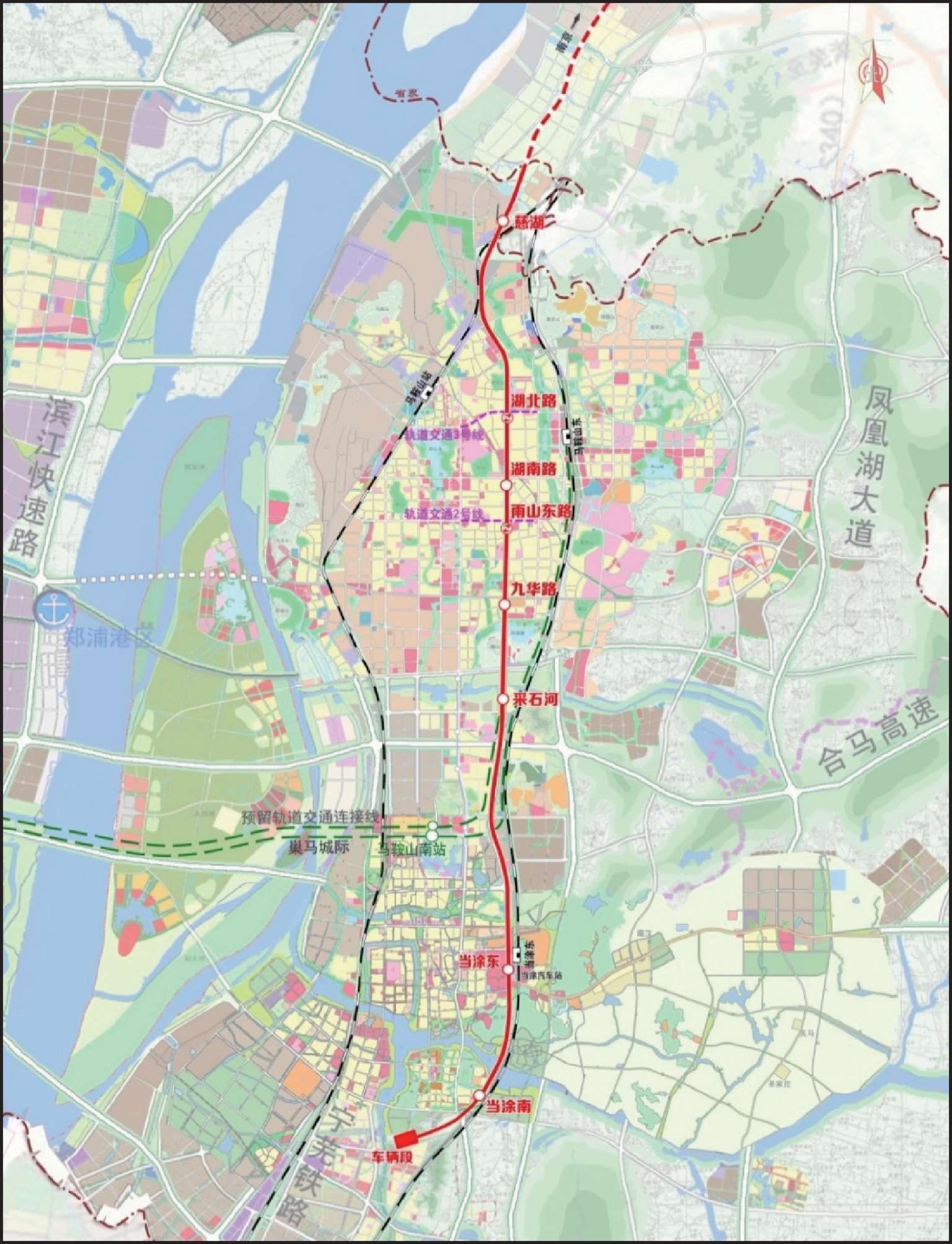 马鞍山段:线路全长 27.72 km,其中,高架线 26.48 km,山岭隧道段 0.66 km,路基段 0.58 km。全线共设 8 座车站,全部为高架站;设当涂南车辆段 1 座。
