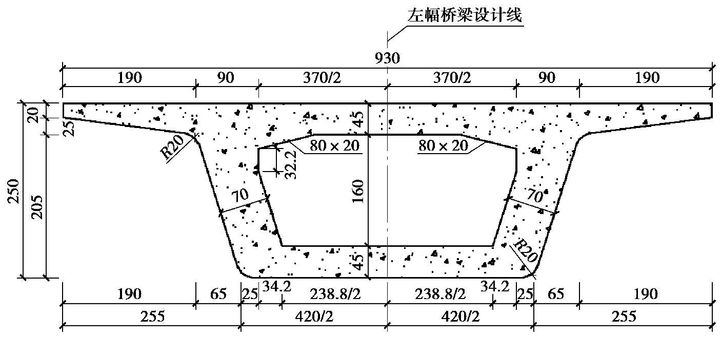 主线桥:0.5 m(防撞栏)+8.5 m(车行道)+0.5 m(防撞栏)+1.0 m(中央分隔带)+0.5 m(防撞栏)+8.5 m(车行道)+0.5 m(防撞栏)= 20 m。