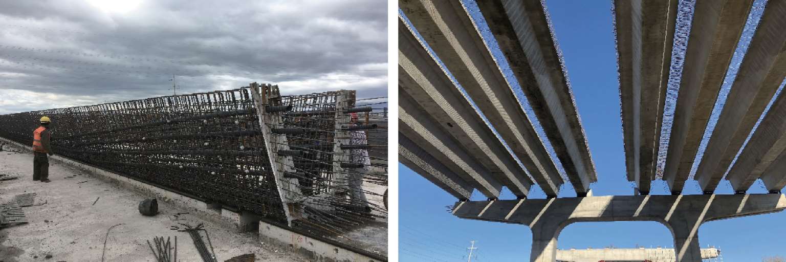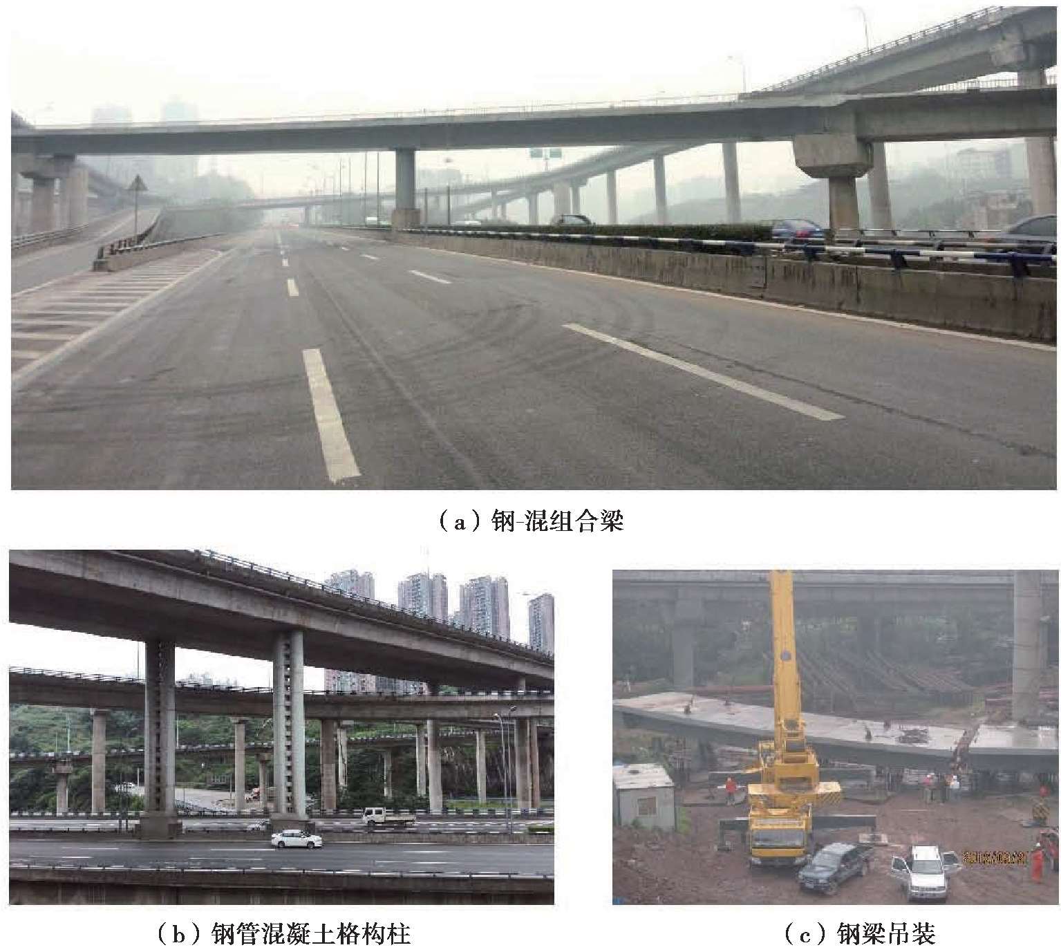 高架桥梁建设中,节点跨线桥梁采用钢-混凝土组合梁,其中钢梁在工厂制造,在现场拼装,混凝土板施工时,钢梁可以承担悬挂模板、混凝土板及施工荷载。该工艺无须设置支撑,可加快施工速度,对现状交通影响较小。